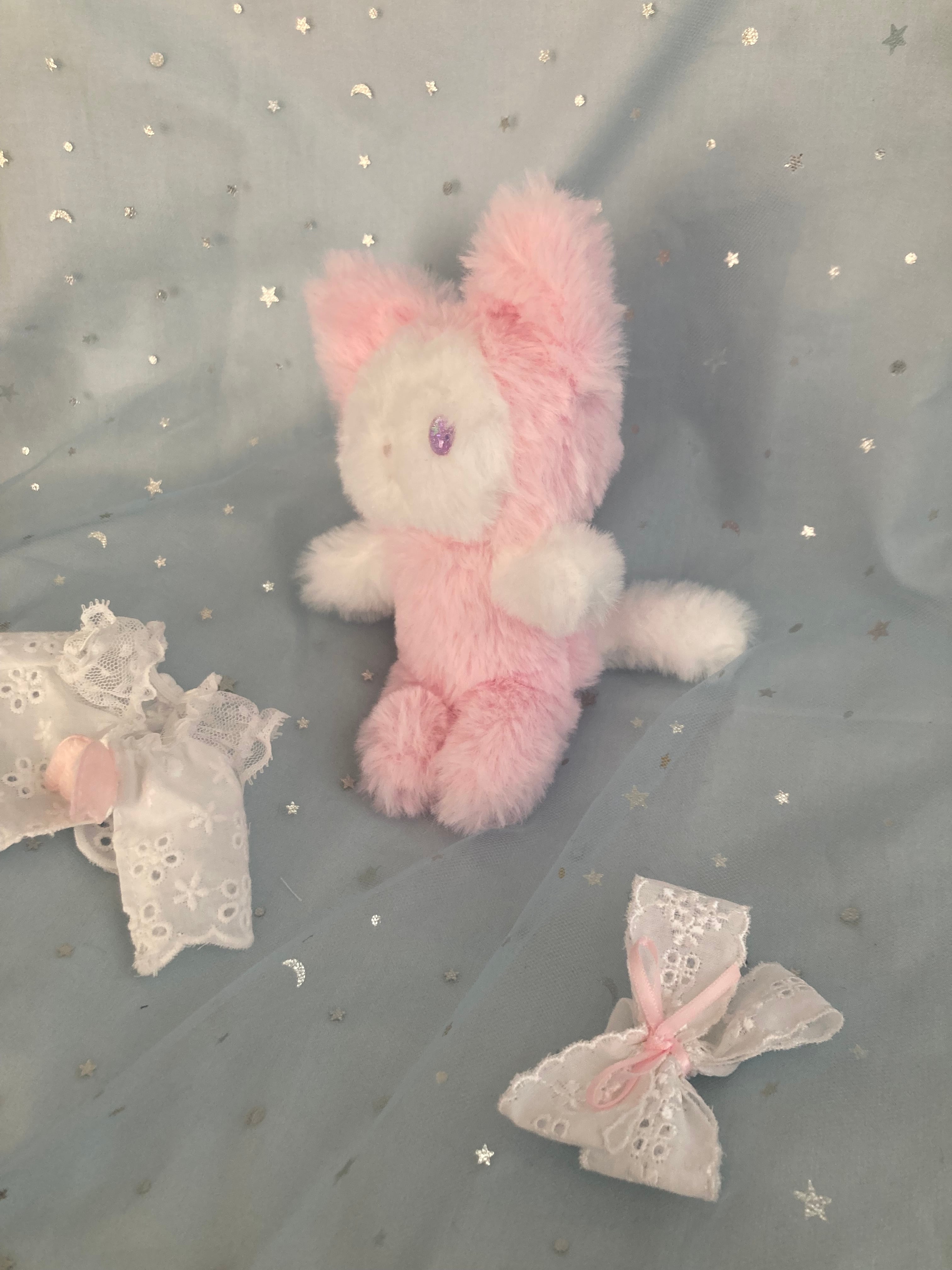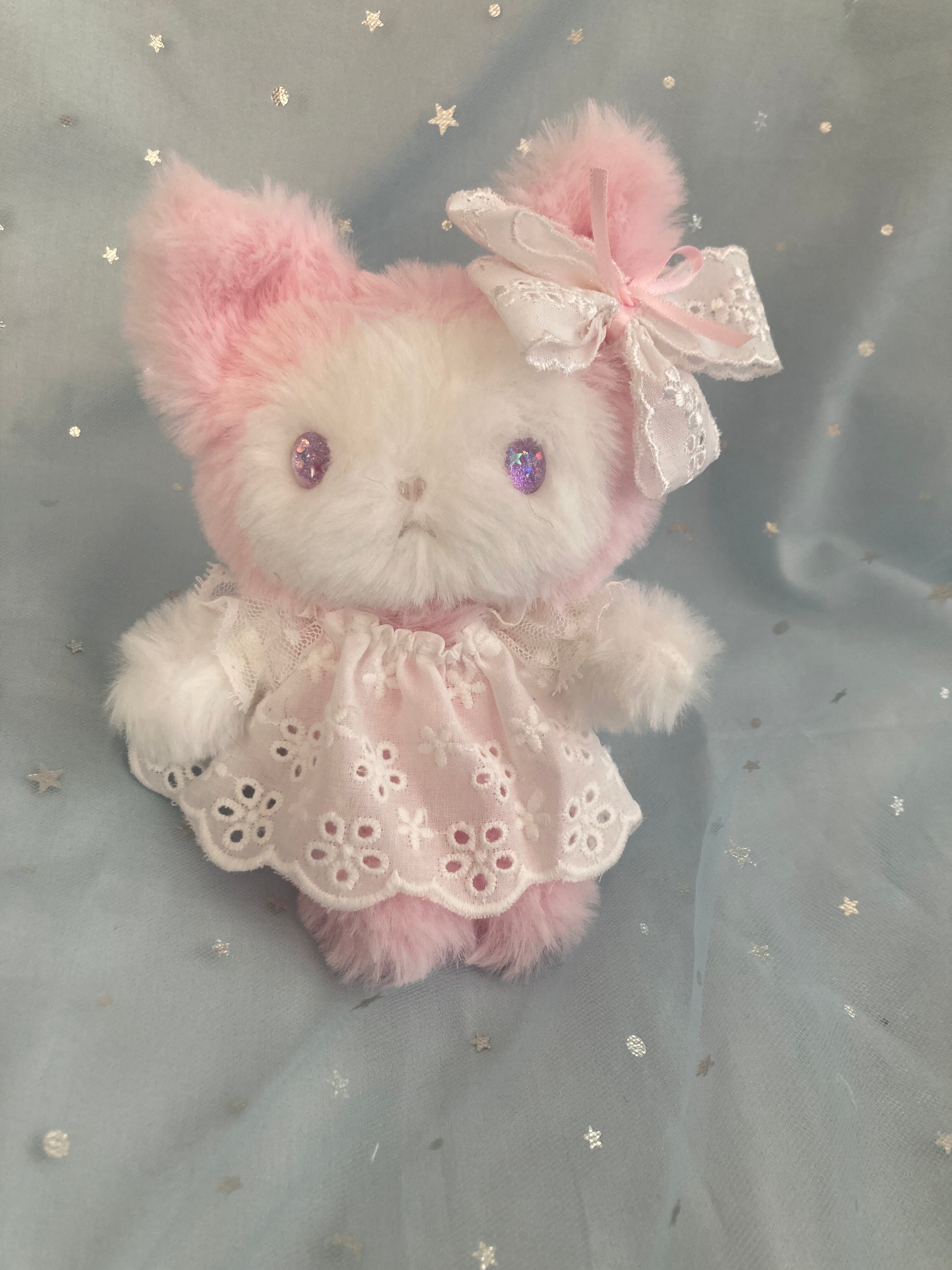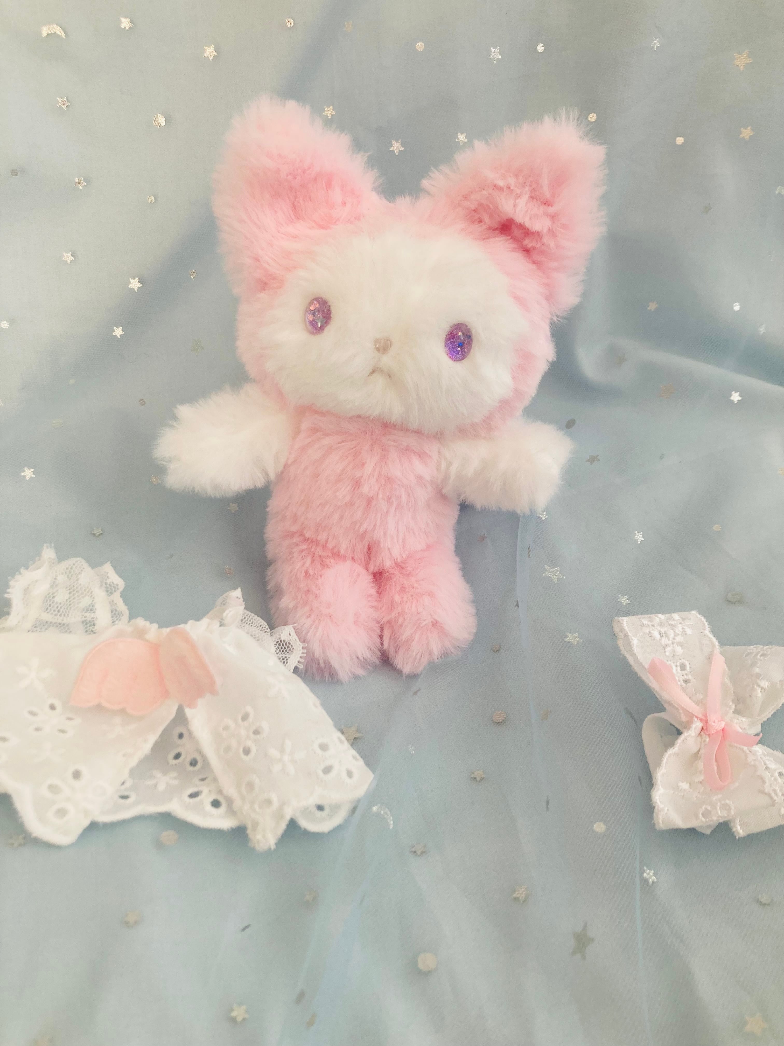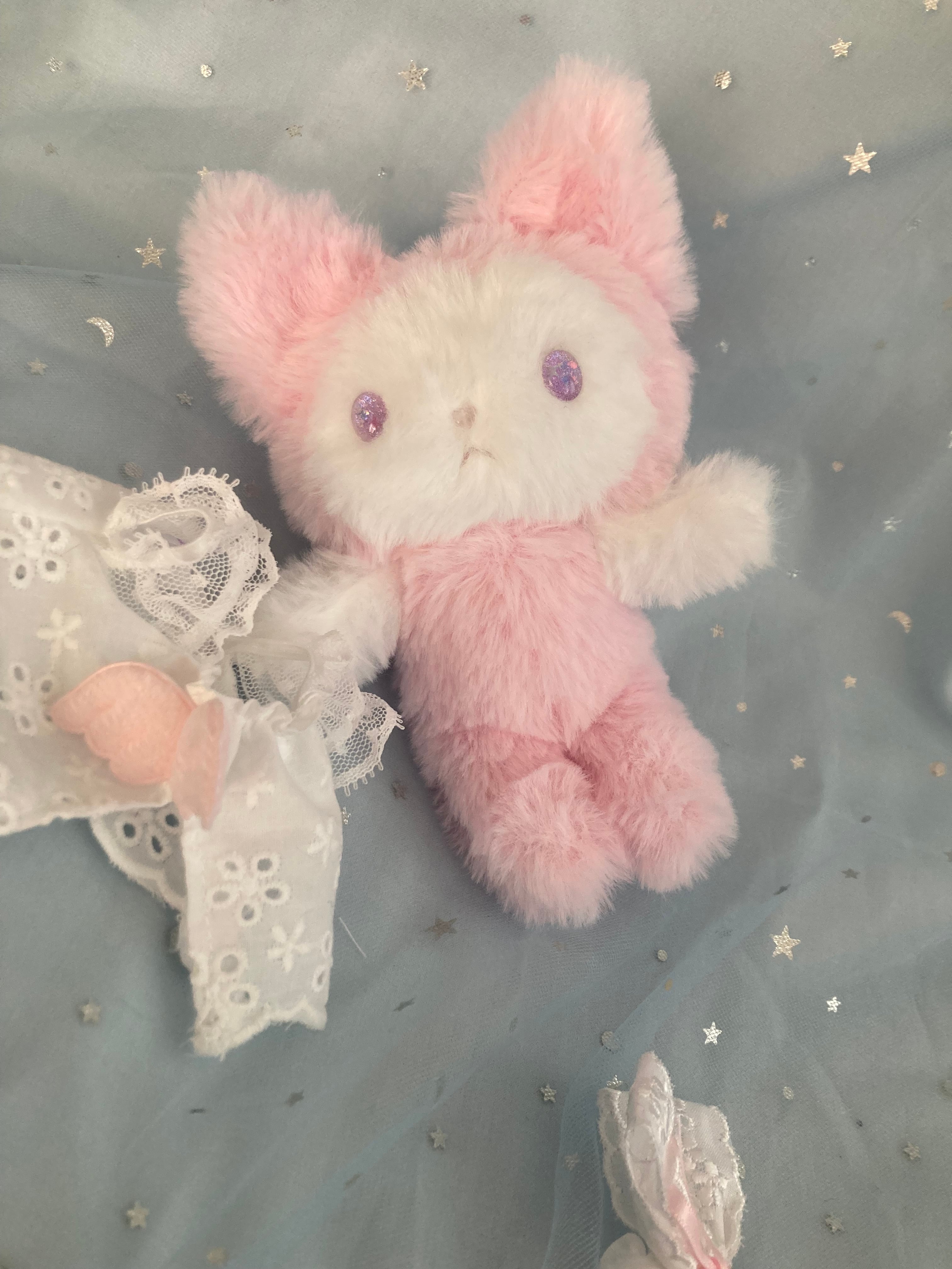 春なのでピンクの羽付きお洋服を着ました。ねこさんのぬいぐるみ