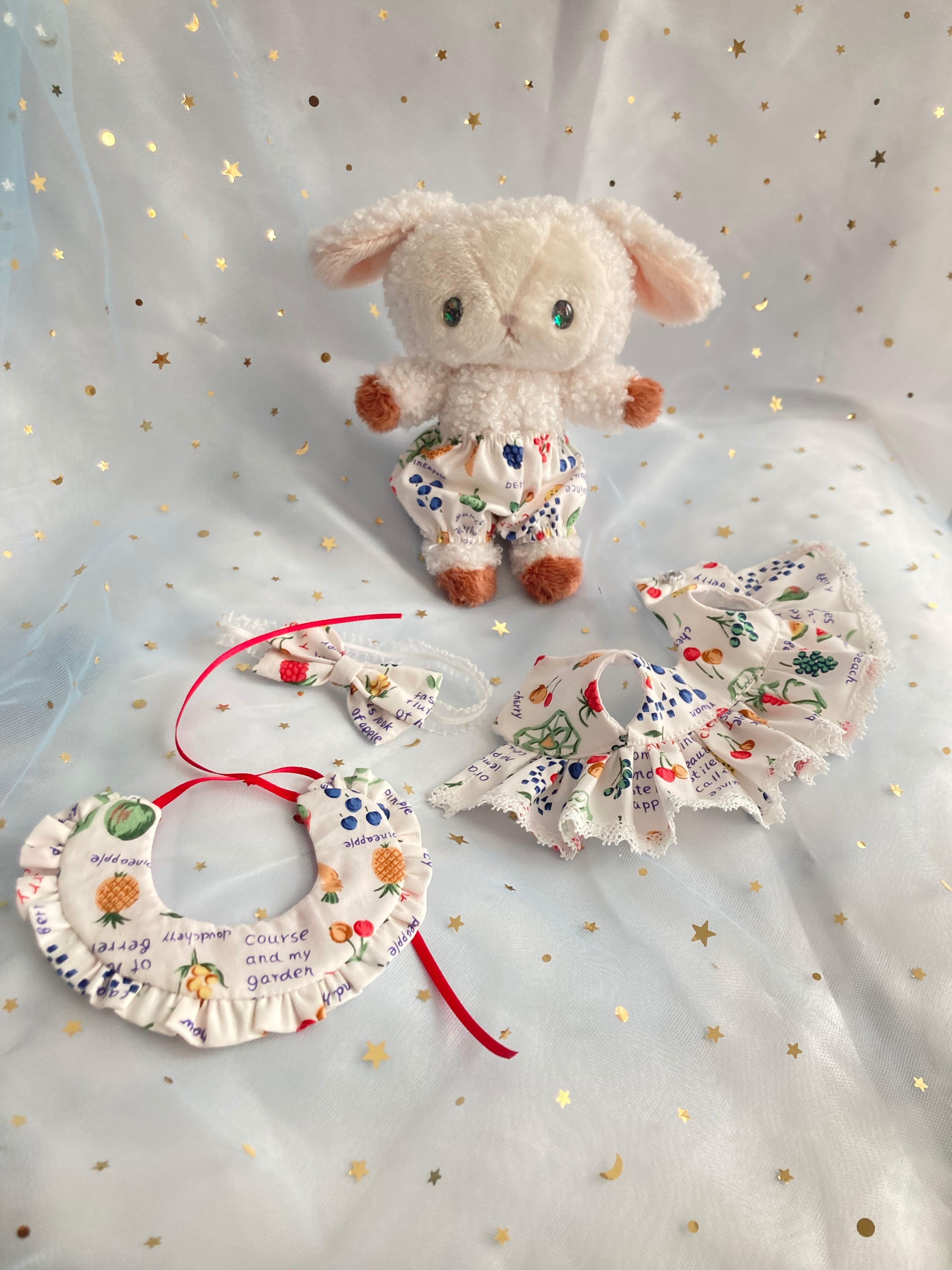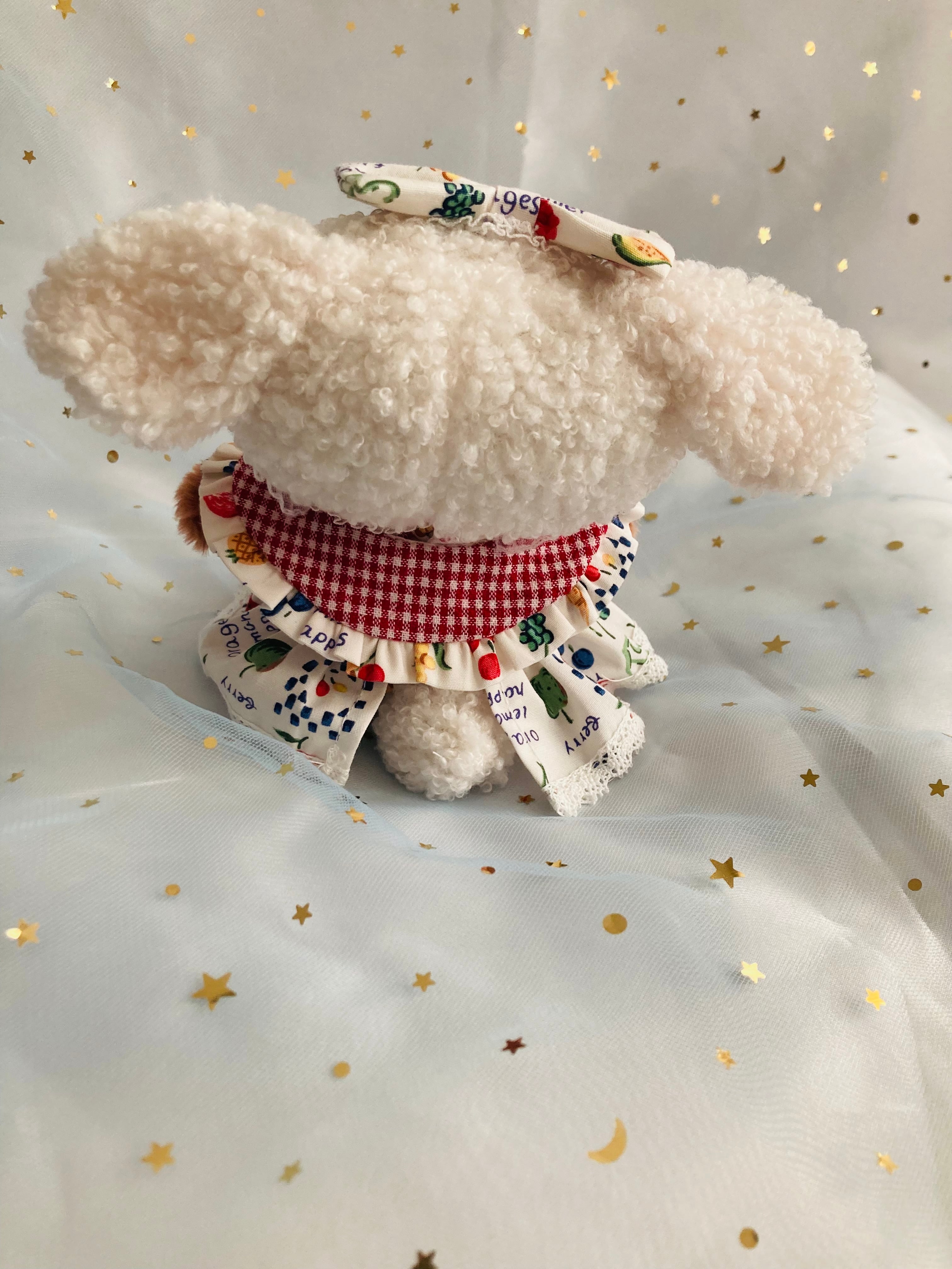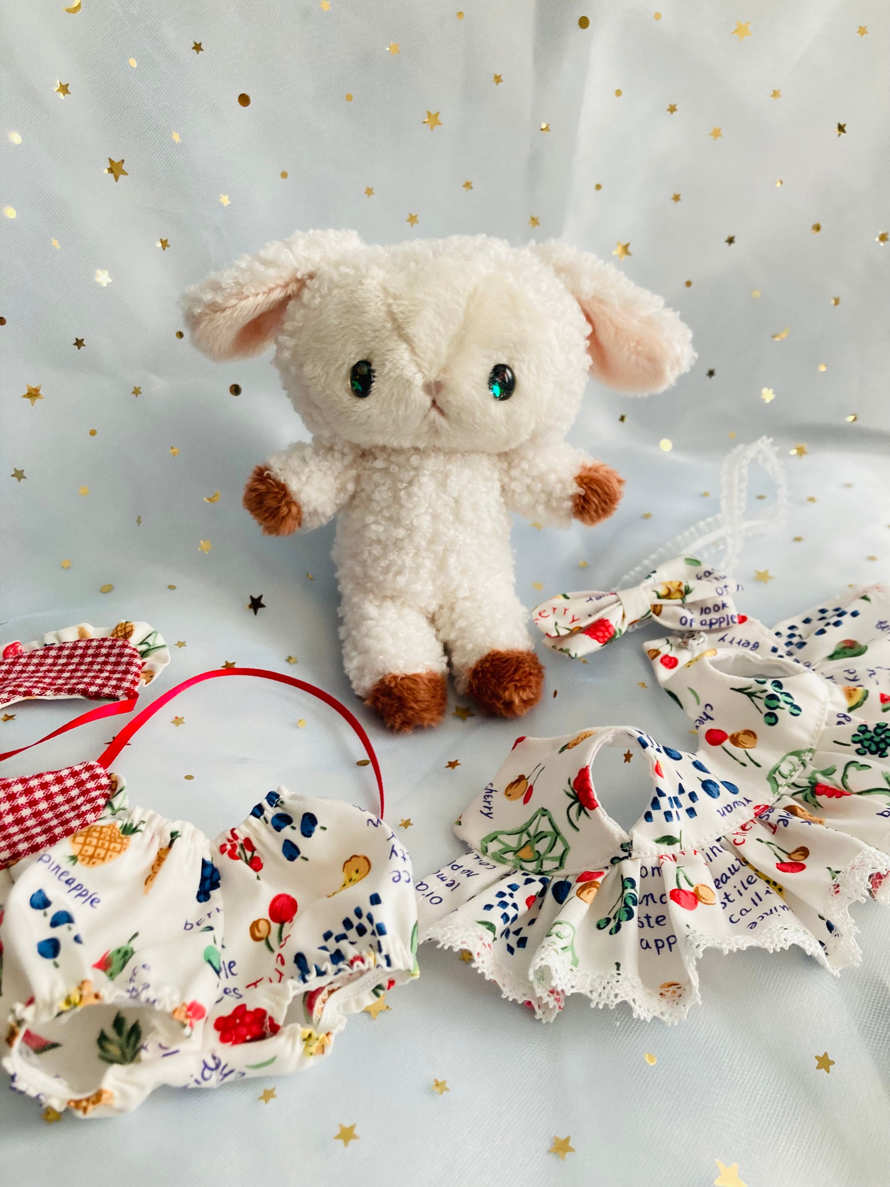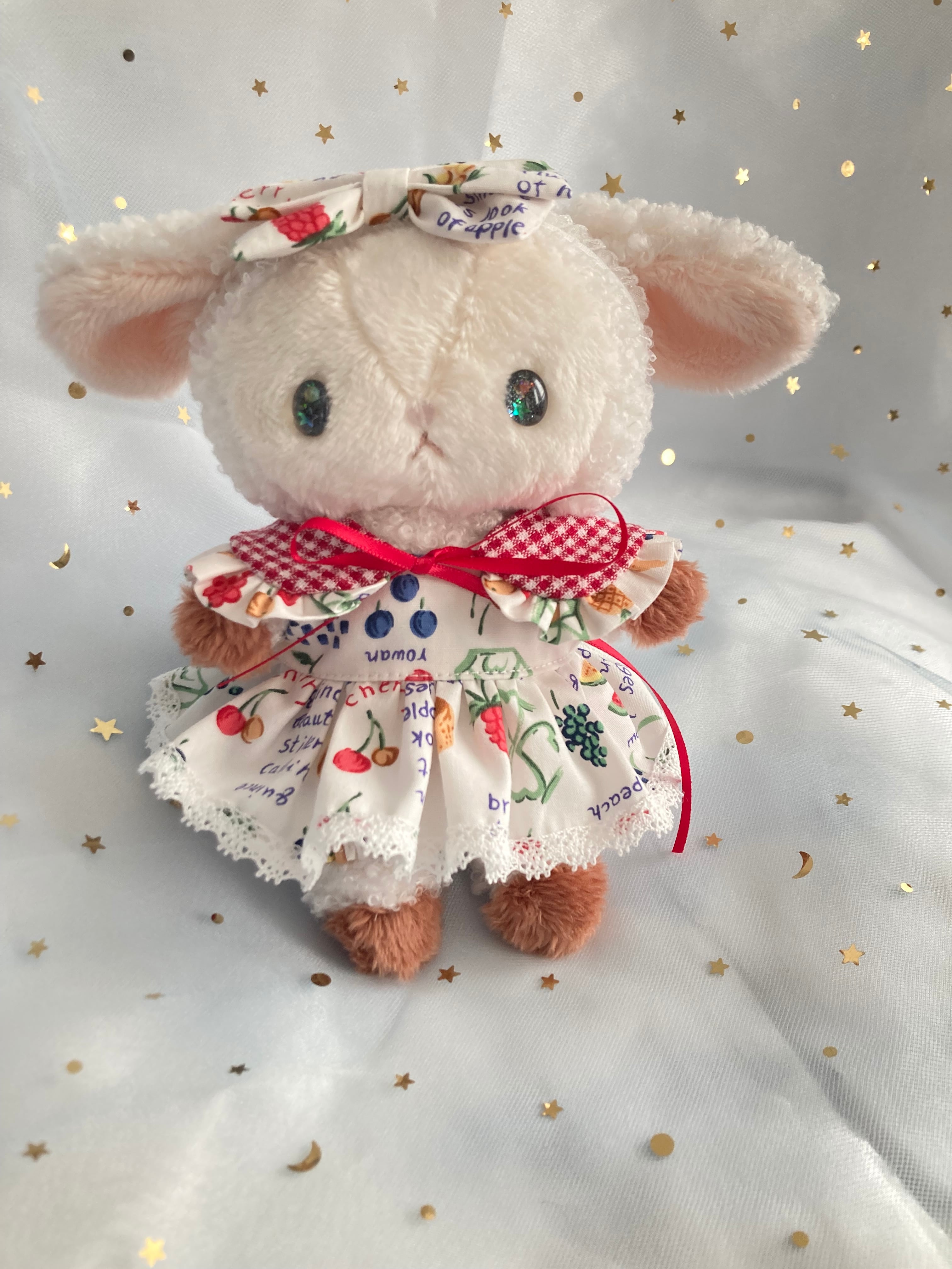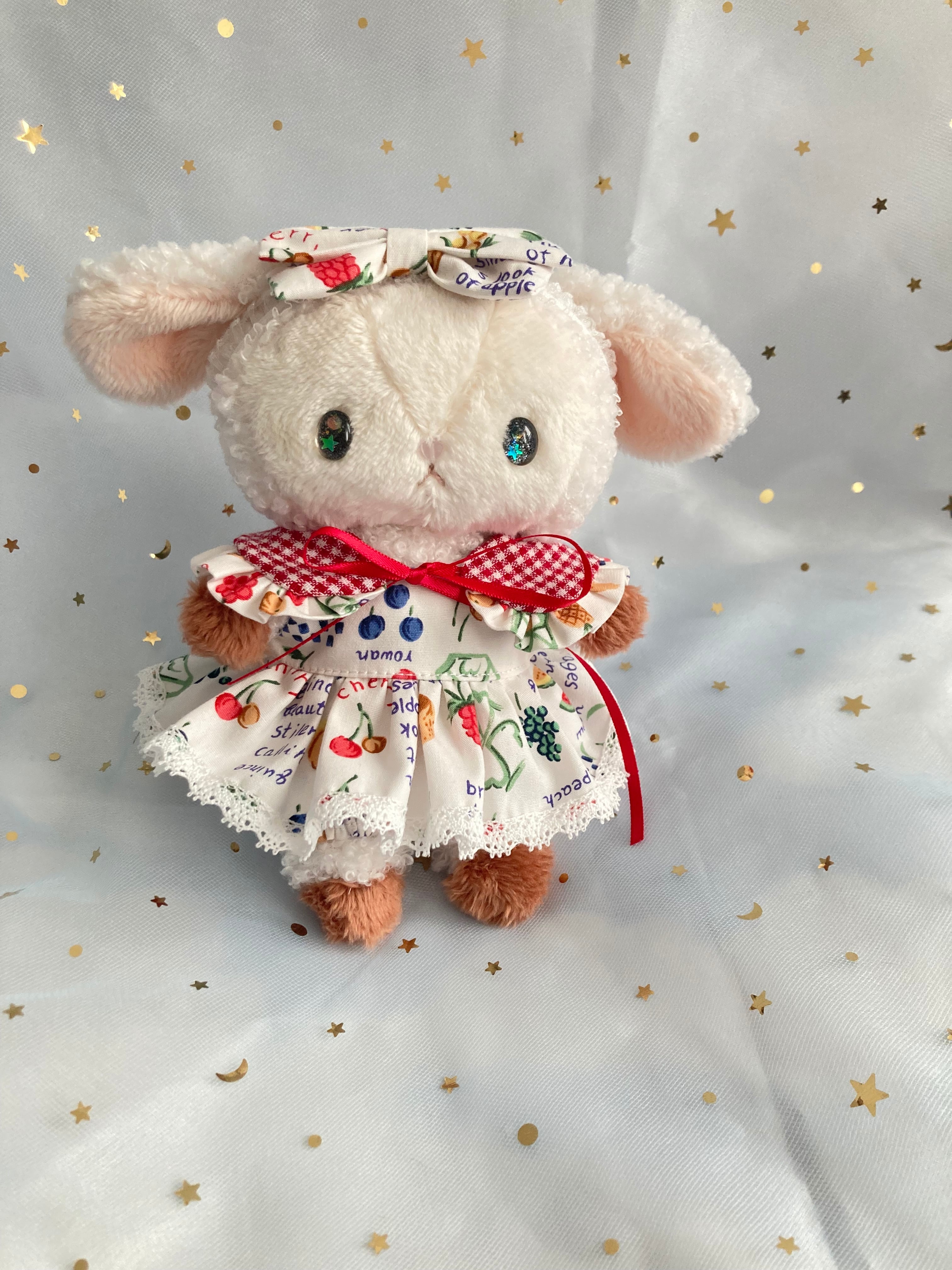 フルーツ柄のお洋服を着たひつじちゃんのぬいぐるみ